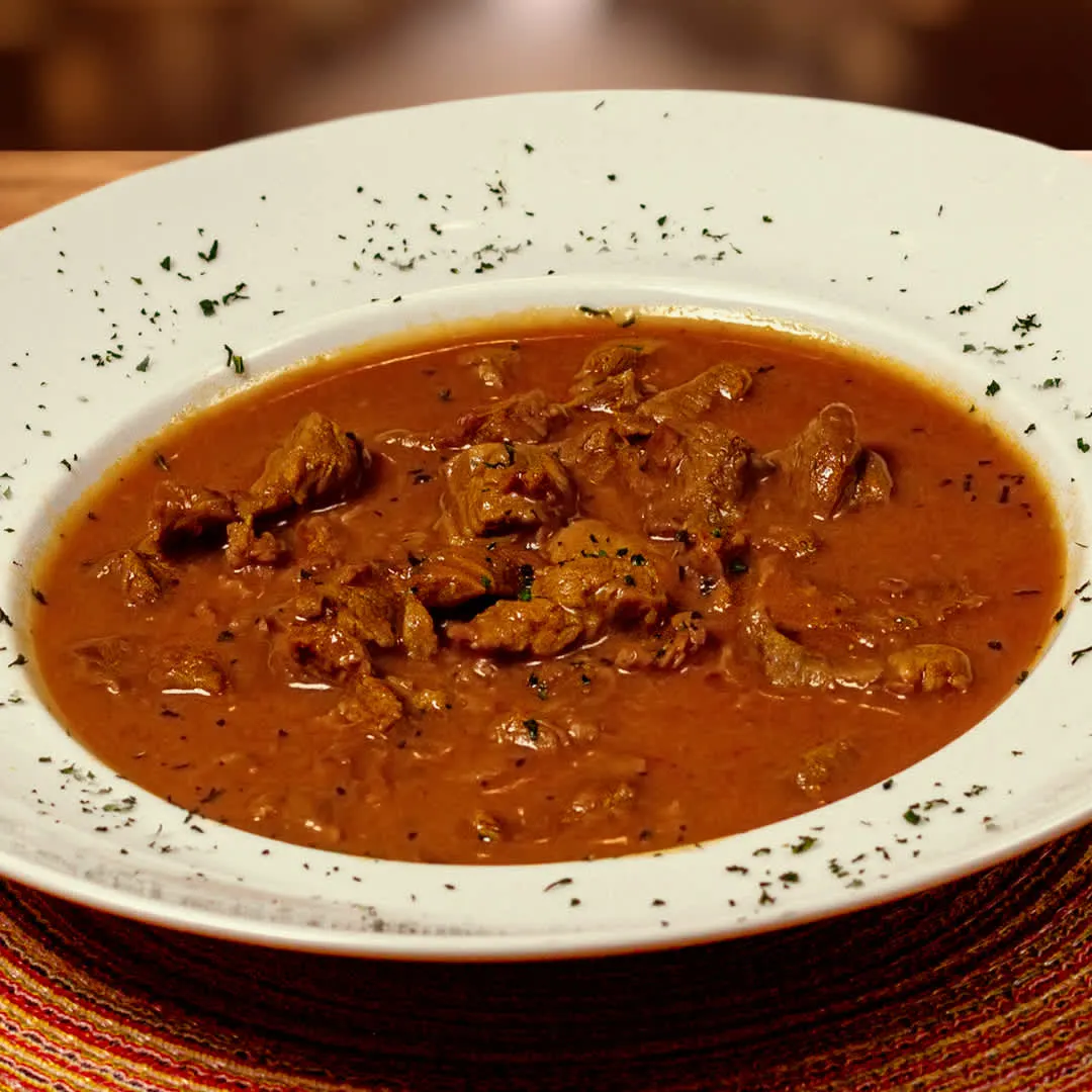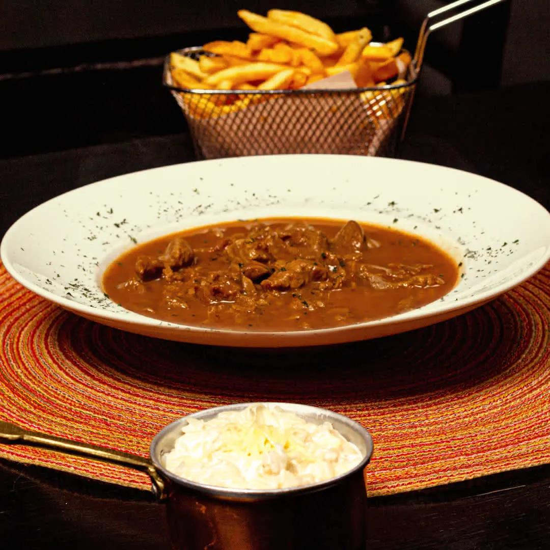 Carne picadinha ao nosso delicioso molho roti, acompanhada de arroz piemontese e fritas
