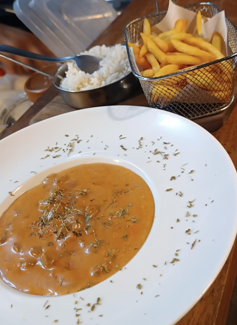 Carne cozida na pressão com cerveja preta, calabresa e molho ferrugem. Vem com arroz e fritas.